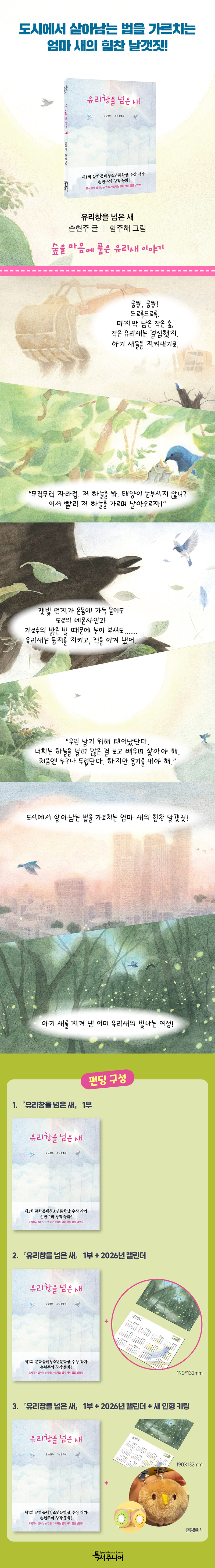 ㈜특별한서재의 아동 브랜드인 특서주니어 어린이문학에서 『유리창을 넘은 새』가 출간되었다. 『유리창을 넘은 새』는 제1회 문학동네 청소년문학상 수상 작가이자 청소년 베스트셀러 『가짜 모범생』 손현주 작가의 환경동화로, 도시 외곽 작은 숲에 둥지를 튼 유리새 가족의 이야기다. 어미 새인 유리새는 도시에서 살아남기 위해, 공사장의 소음과 진동을 이겨 내고 분진 속에서도 아기 새들을 보호한다. 밤에는 네온사인과 가로수 불빛이 둥지로 가는 길을 가로막고, 때로는 천적의 공격에도 아기 새들을 보호하며 공존을 모색하지만 도시의 가장 큰 위험은 ‘보이지 않는 벽’ 유리창이다. 유리새는 끝내 아기 새들에게 자신이 가르쳐 줄 수 있는 모든 것을 가르친 뒤 세상으로 떠나 보낸다. 아기 새들의 진짜 비행을 지켜본 뒤, 유리새도 숲을 마음에 품고 보이지 않는 벽을 향해 자신도 모르는 마지막 비행을 시작한다.