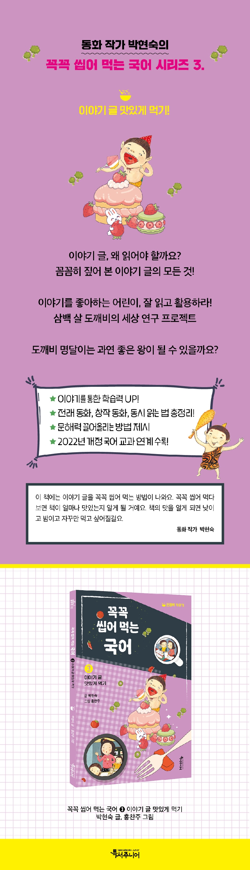 ㈜특별한서재의 아동 브랜드인 특서주니어의 어린이교양에서 문해력 키우기 ‘꼭꼭 씹어 먹는 국어’ 시리즈 3권 『이야기 글 맛있게 먹기』가 출간되었다. ‘꼭꼭 씹어 먹는 국어’ 시리즈는 베스트셀러 동화 작가 박현숙이 아이들의 문해력을 키우기 위해 요즘 아이들의 교육 환경에 맞춰 재미있는 이야기를 강화하고 학습력을 높인 책이다. 특히 아이들이 어려워 하는 국어 학습의 기본 개념인 종류별 글 읽기와 글쓰기 방법 등 국어 학습의 기초를 가뿐하게 소화할 수 있도록 했다. 시리즈의 3권 『이야기 글 맛있게 먹기』는 전래 동화와 창작 동화, 동시를 효과적으로 읽고 활용하는 방법을 제시했다. 삼백 살 도깨비를 통해 아이들이 이야기 글에 흥미를 느낄 수 있도록 돕고, 한 권의 책을 읽더라도 제대로 읽는 것이 중요하다는 사실을 알려 준다.