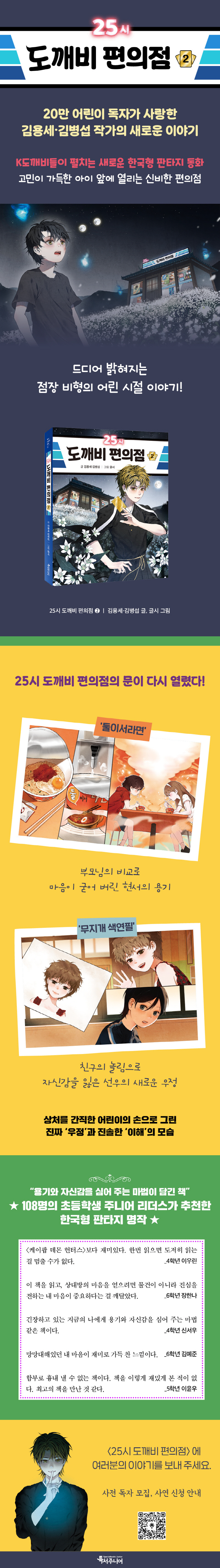 『25시 도깨비 편의점 2』는 상처받은 아이들이 용기를 내어 스스로의 세상을 바꾸어 가는 과정을 그린 성장 이야기다. 진정한 변화는 언제나 내 마음에서부터 시작된다. 25시 도깨비 편의점에서 어린이들은 다시 세상으로 나아갈 힘을 배운다.