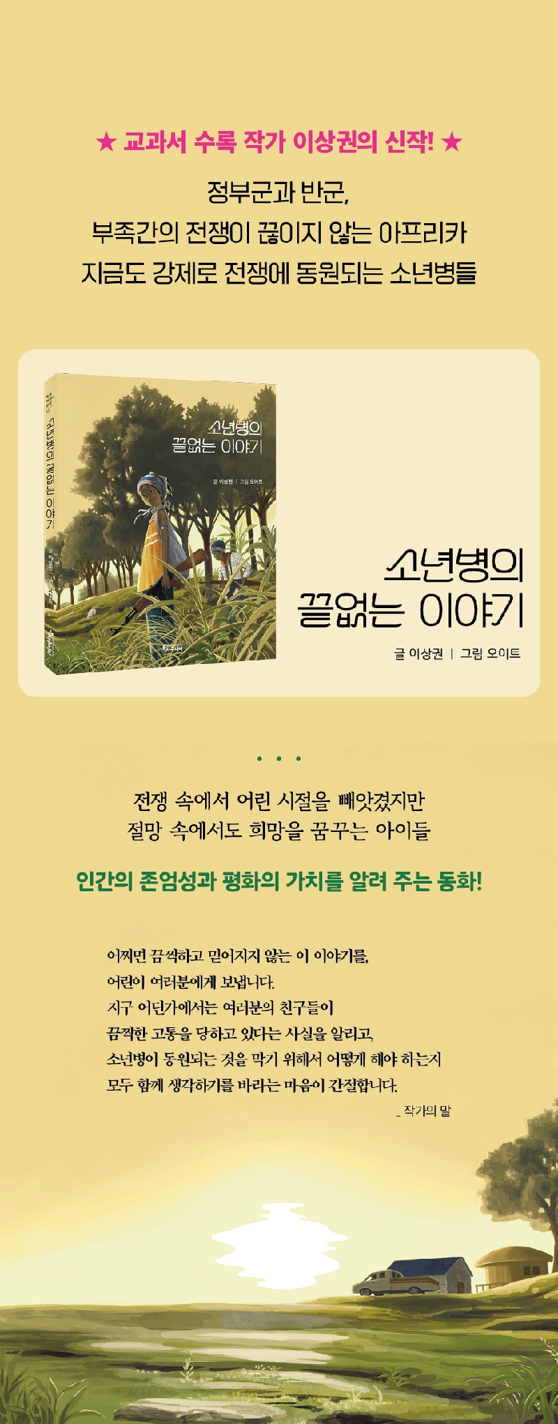 ㈜특별한서재의 아동 브랜드인 특서주니어 어린이문학에서 『소년병의 끝없는 이야기』가 출간되었다. 이 작품은 전쟁 속에서 어린 시절을 빼앗긴 아이들을 통해 오늘을 살아가는 어린이들에게 평화의 의미를 생각하게 하는 중·고학년 동화이다. 특히 과거의 사건이 아니라 지금도 세계 곳곳에서 강제로 전쟁에 동원되는 소년병 이야기여서 더욱 울림이 깊다.