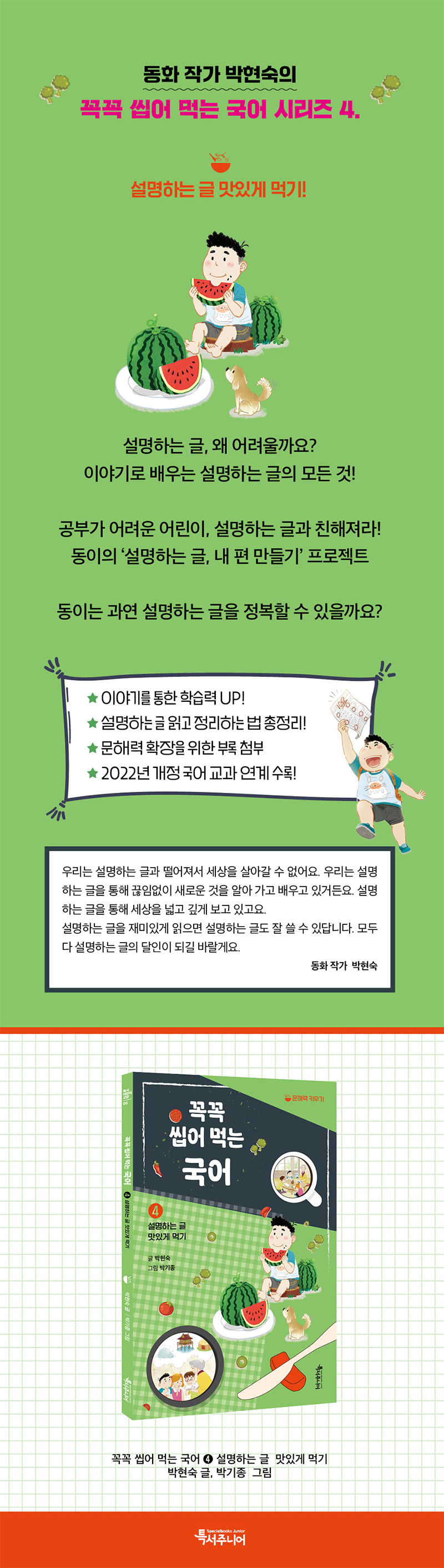 ㈜특별한서재의 아동 브랜드인 특서주니어의 어린이교양에서 문해력 키우기 ‘꼭꼭 씹어 먹는 국어’ 시리즈 4권 『설명하는 글 맛있게 먹기』가 출간되었다. ‘꼭꼭 씹어 먹는 국어’ 시리즈는 베스트셀러 동화 작가 박현숙이 아이들의 문해력을 키우기 위해 요즘 아이들의 교육 환경에 맞춰 재미있는 이야기를 강화하고 학습력을 높인 책이다. 특히 아이들이 어려워 하는 국어 학습의 기본 개념인 종류별 글 읽기와 글쓰기 방법 등 국어 학습의 기초를 가뿐하게 소화할 수 있도록 했다. 시리즈 4권 『설명하는 글 맛있게 먹기』는 동이가 특별한 선생님과 함께 ‘설명하는 글, 내 편 만들기’ 프로젝트를 통해 설명하는 글의 중요성을 깨닫고 개념을 정리하며, 어렵고 지루하게 느껴지던 설명문이 곱씹을수록 재미있고 친근한 글로 다가오는 과정을 담고 있다.