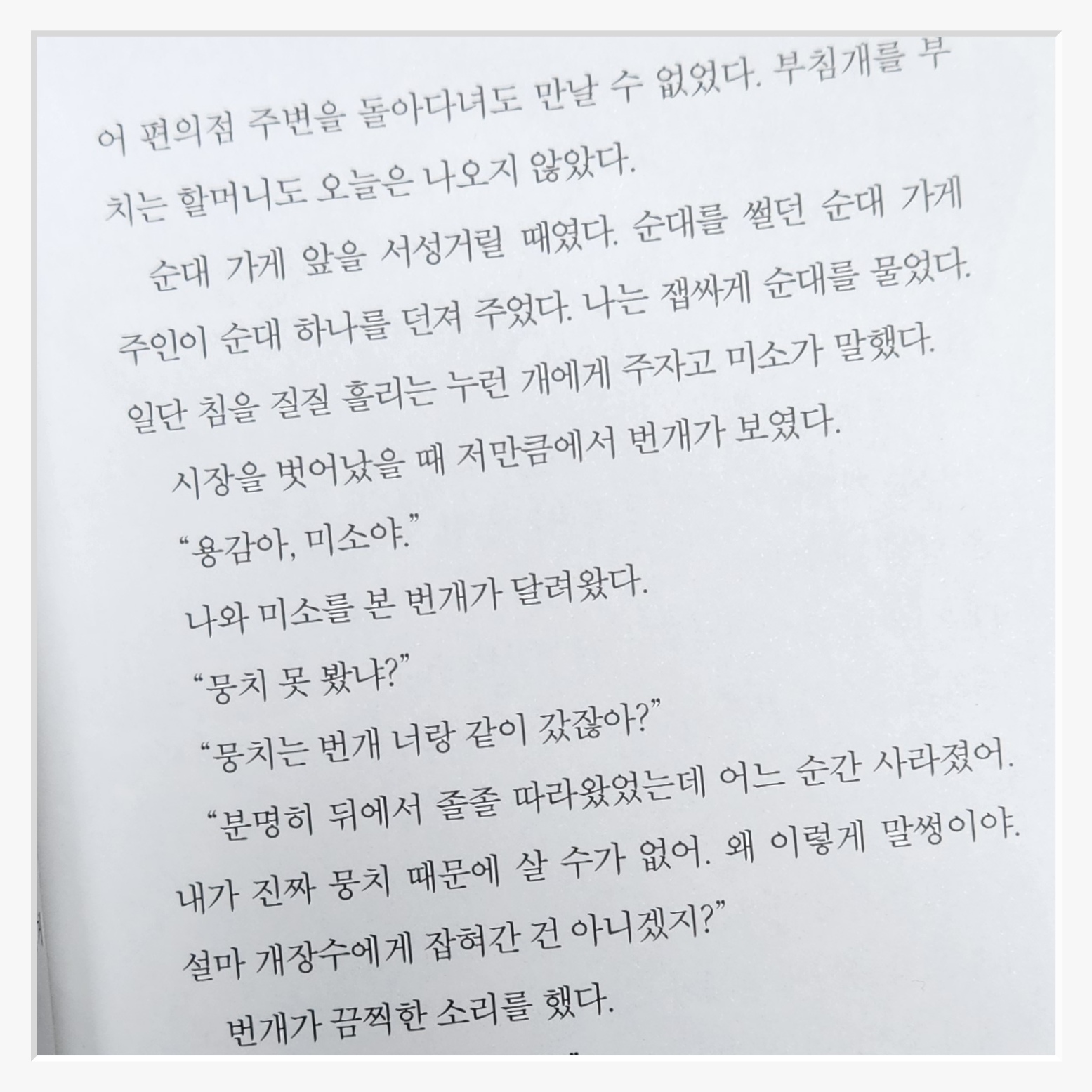 책 속 들개들은 보호받던 존재에서 서로를 지켜주는 존재로 성장한다. 번개는 대장을 대신해 무리를 이끌고, 용감이는 이름처럼 두려움을 넘어선다. 미소와 뭉치도 갈등과 오해 속에서 진짜 용기를 배운다.